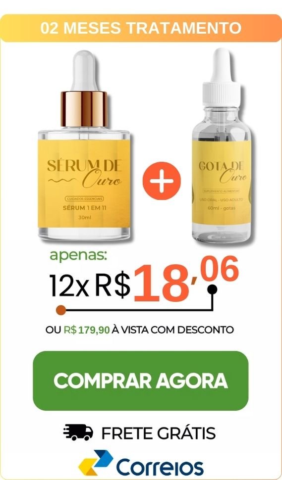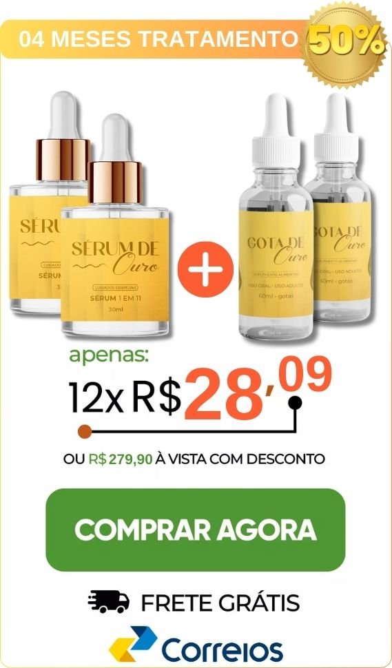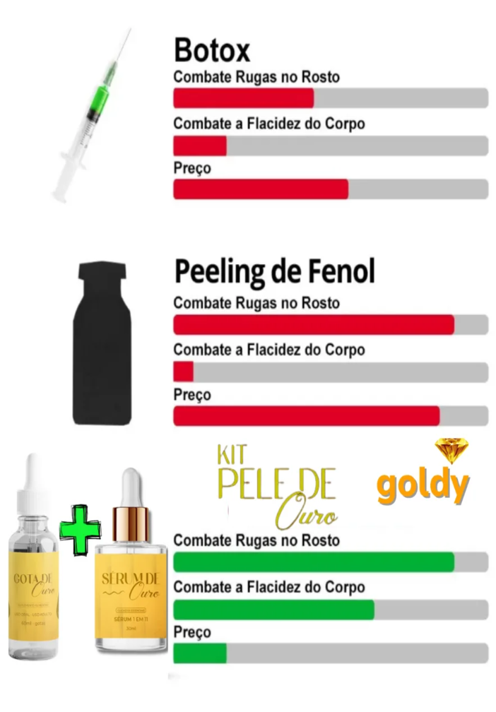 O Kit Pele de Ouro é um tratamento com formulação importada do Egito que contém um Sérum e um Frasco em Gotas, fazendo com que o tratamento traga 2x MAIS resultados na METADe do tempo! Ele age regenerando sua pele com a Tecnologia Ouro Luxor 24k, que impede os hormônios do envelhecimento e constrói novas camadas na sua pele até 13 anos mais jovem!